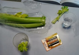 Los materiales que hemos utilizado son: un vasito de plástico, agua, una ramita de apio y colorante alimentario.